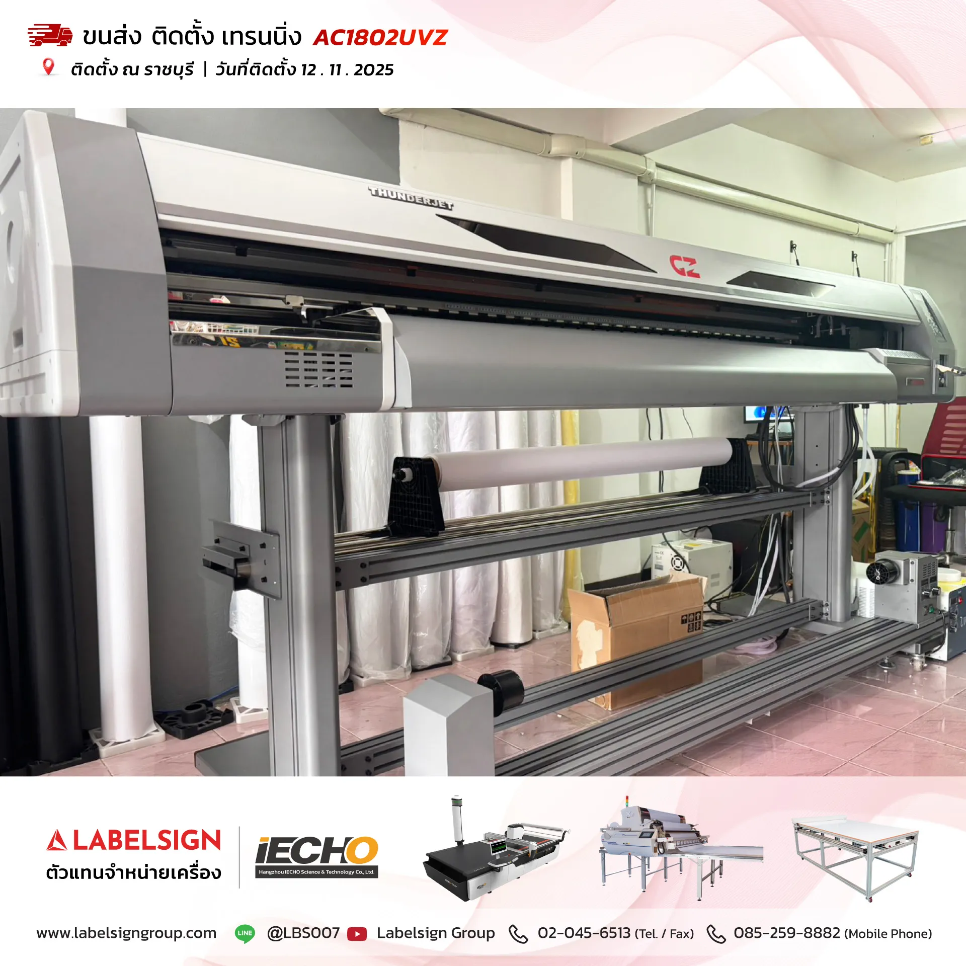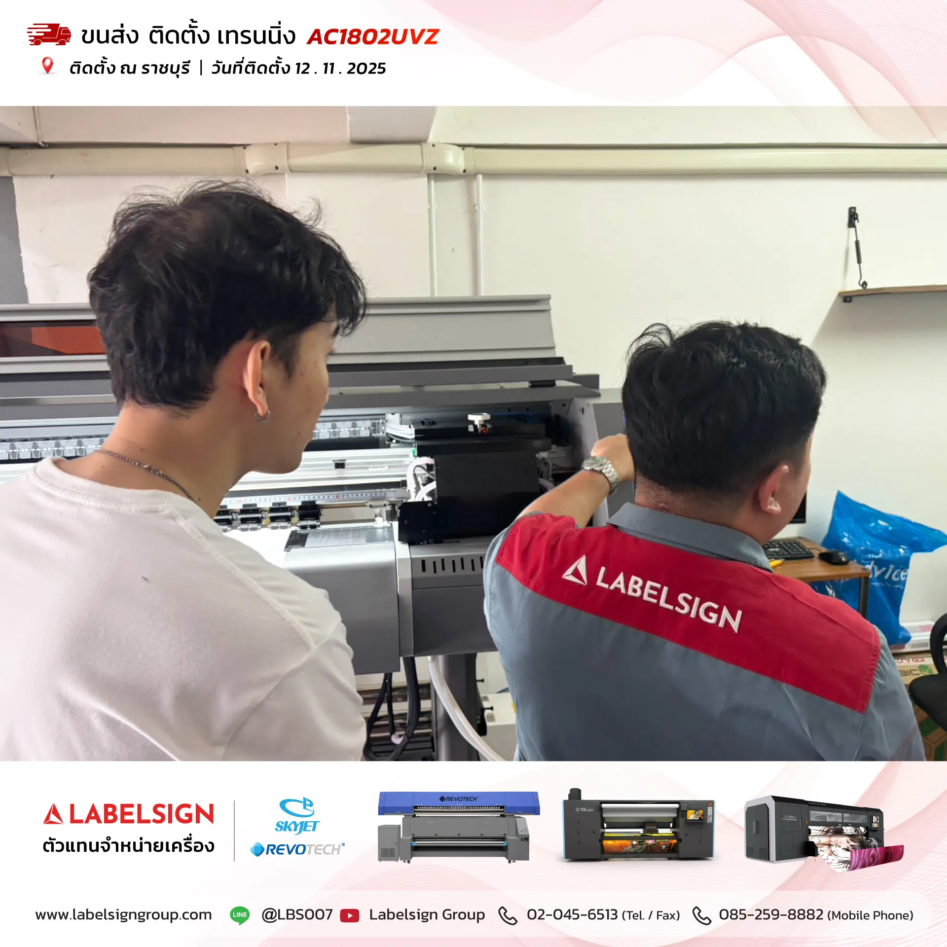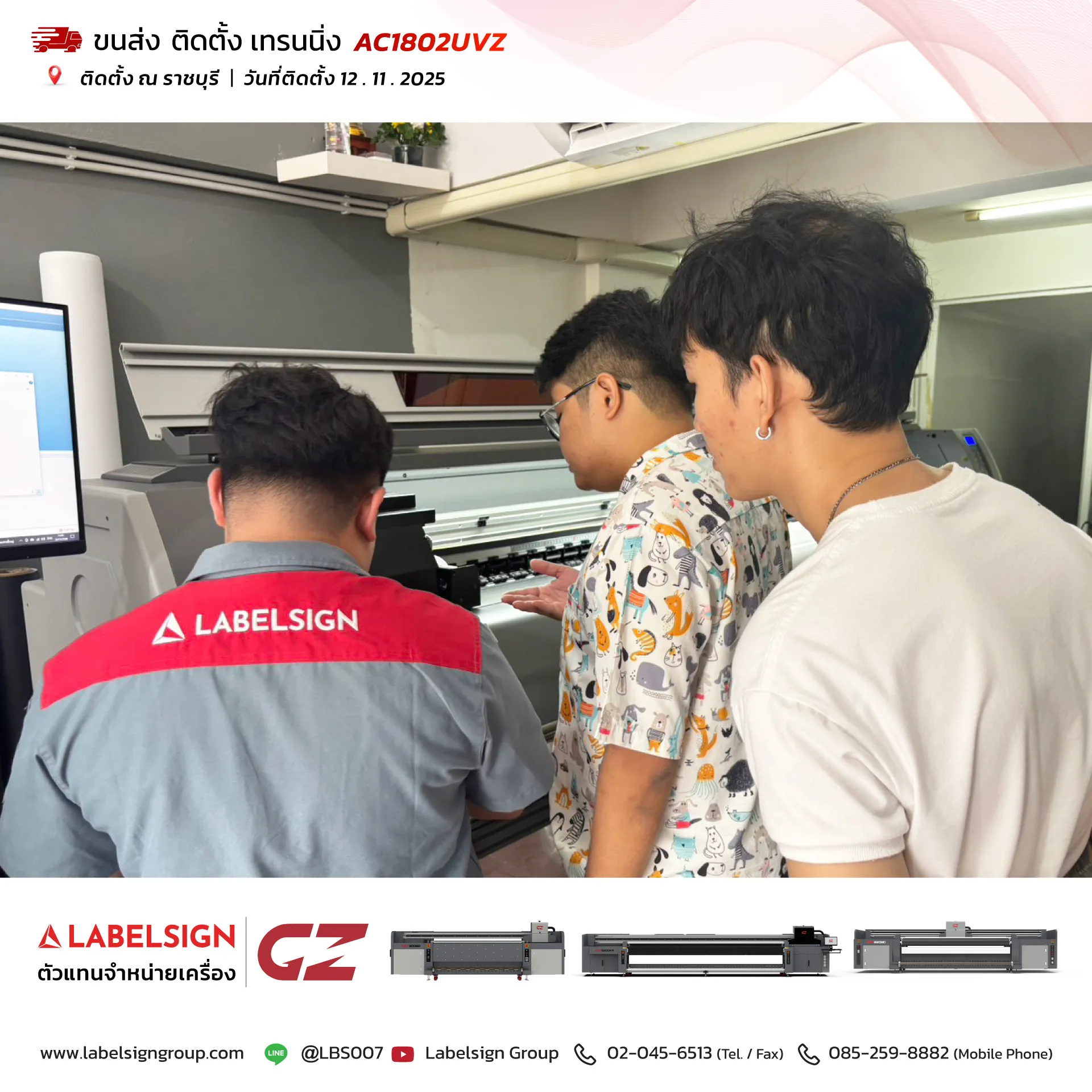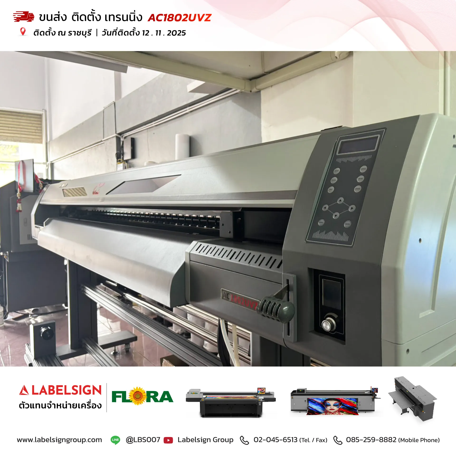 12 พฤศจิกายน 2025 จัดส่ง ติดตั้ง เทรนนิ่ง เครื่องพิมพ์ยูวีชนิดม้วน Roll To Roll UV Printer Model : AC1802UVZ ณ ราชบุรี ขอบพระคุณลูกค้าที่เลือกใช้บริการ "เลเบิ้ลไซน์"
