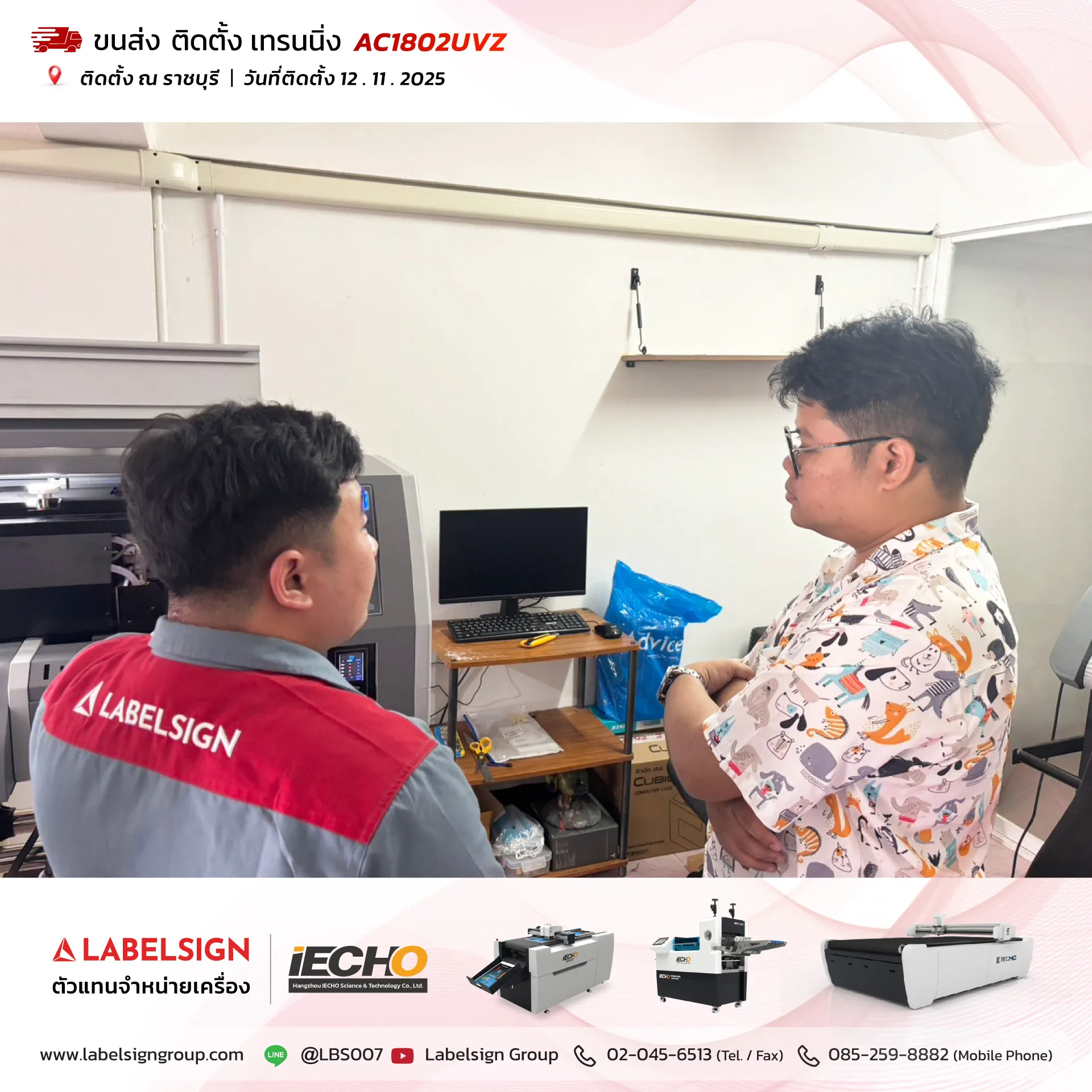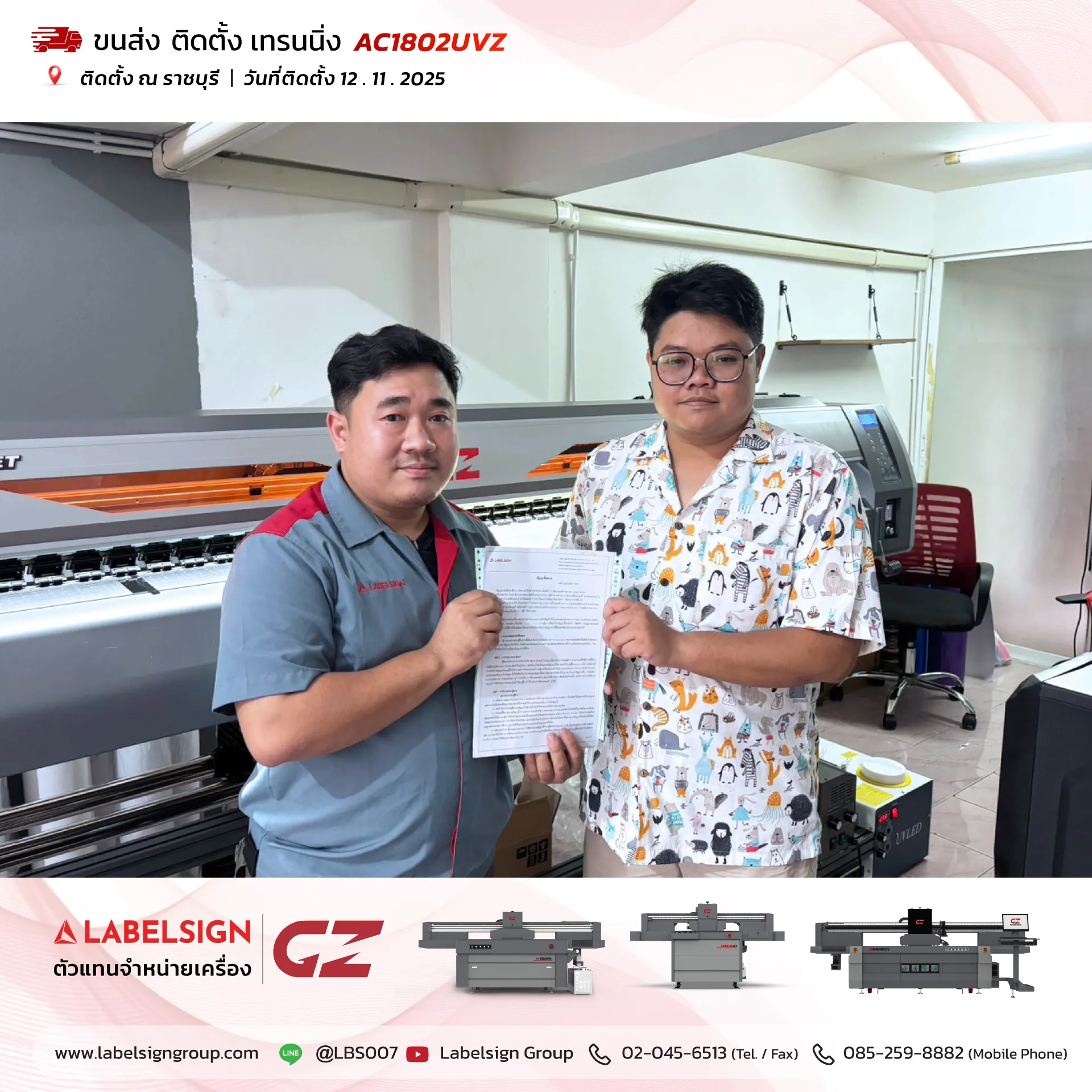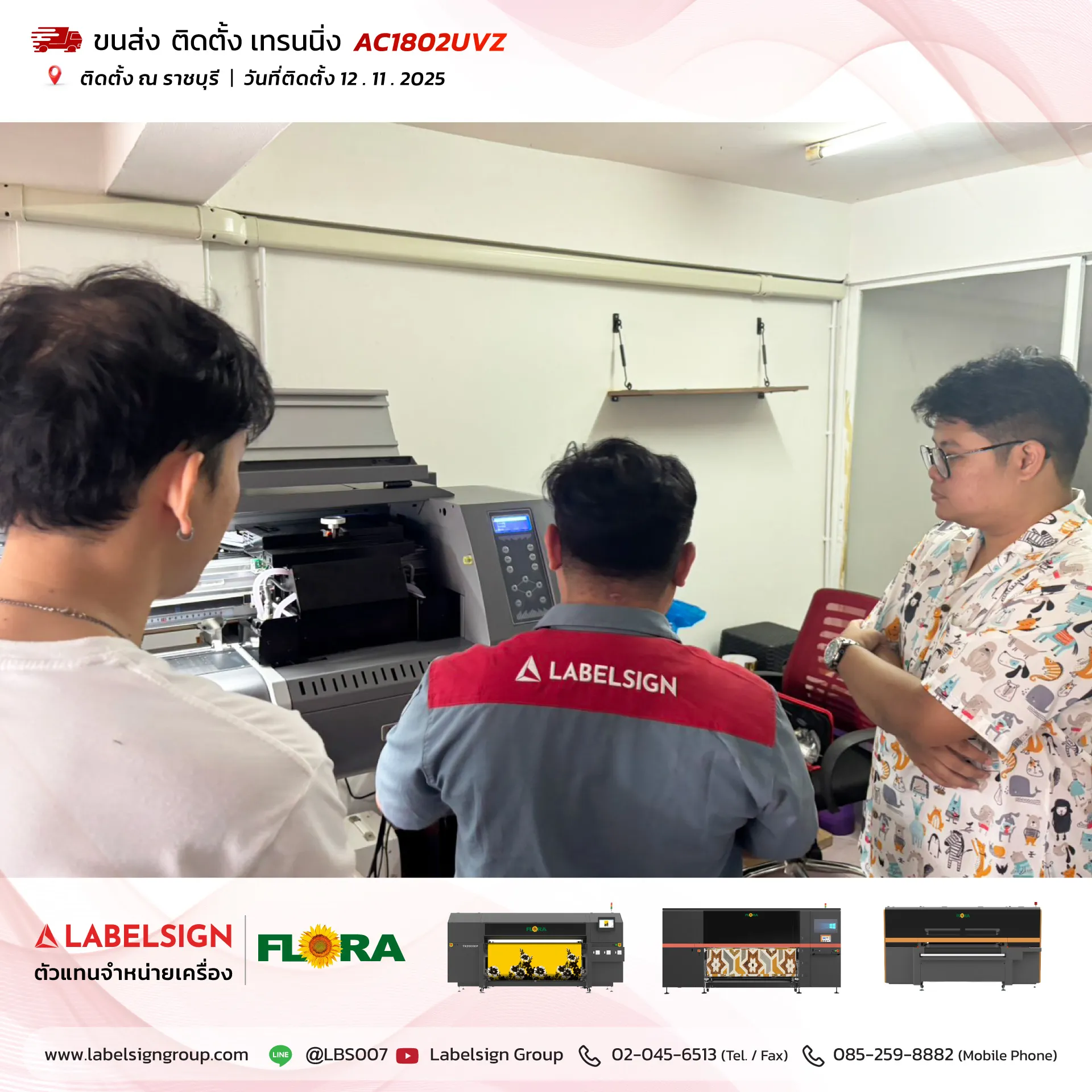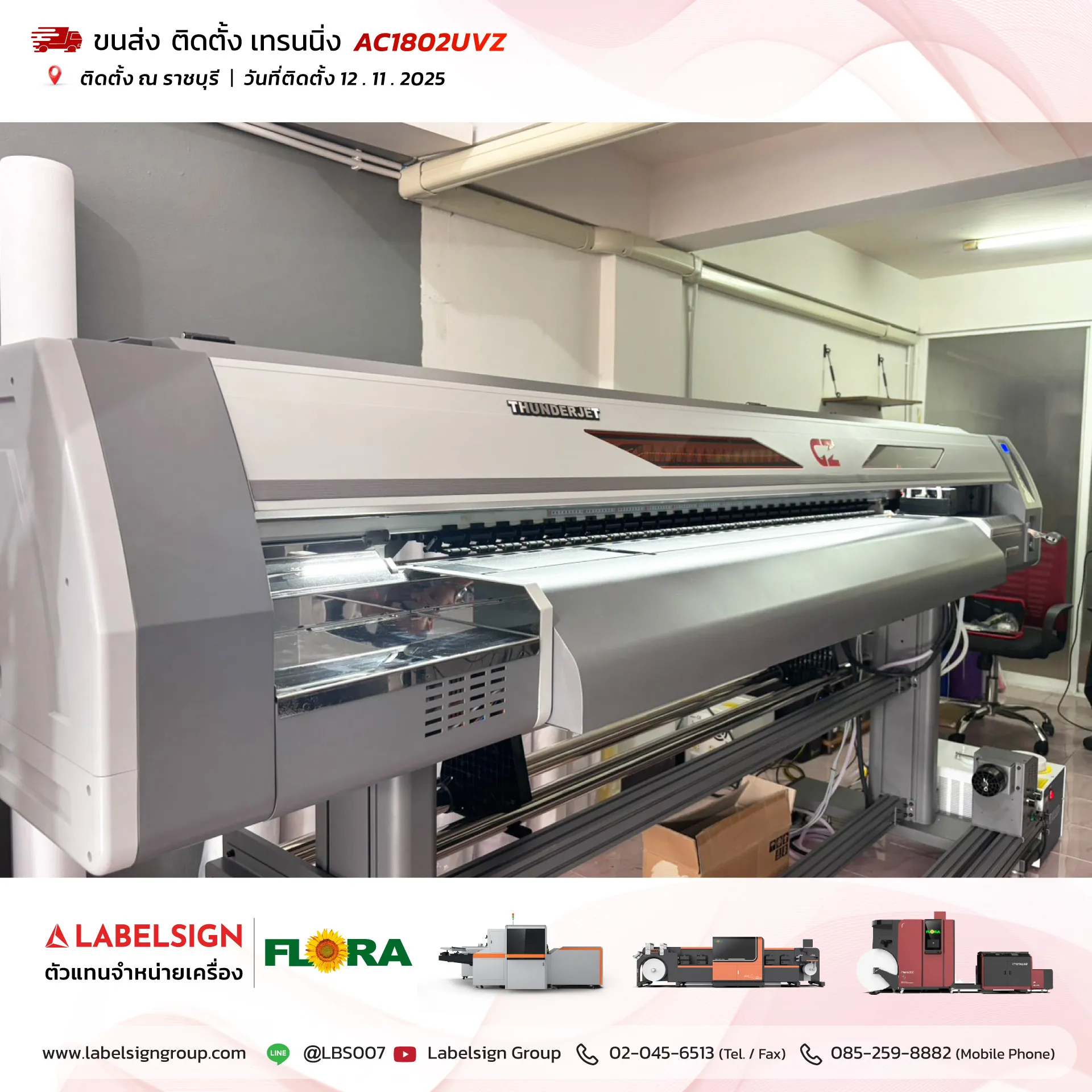 12 พฤศจิกายน 2025 จัดส่ง ติดตั้ง เทรนนิ่ง เครื่องพิมพ์ยูวีชนิดม้วน Roll To Roll UV Printer Model : AC1802UVZ ณ ราชบุรี ขอบพระคุณลูกค้าที่เลือกใช้บริการ "เลเบิ้ลไซน์"