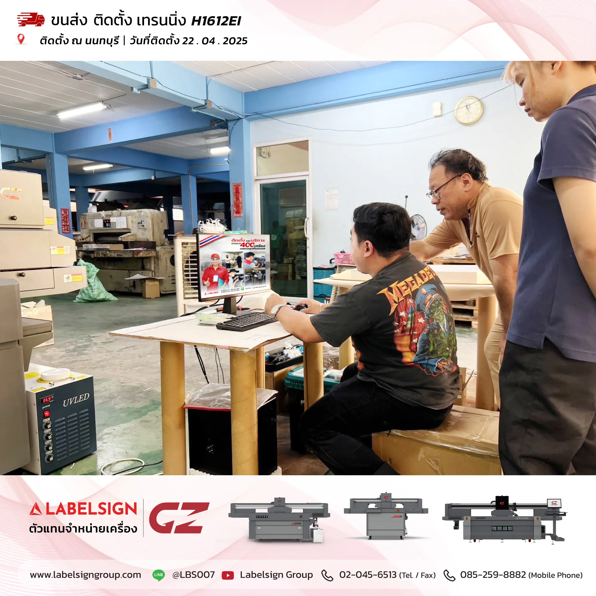 22 เมษายน 2025 จัดส่ง ติดตั้ง เทรนนิ่ง เครื่องพิมพ์ยูวี ชนิดแผ่น Flatbed UV Printing Machine model H1612EI ณ นนทบุรี ขอบพระคุณลูกค้าที่เลือกใช้บริการ "เลเบิ้ลไซน์"