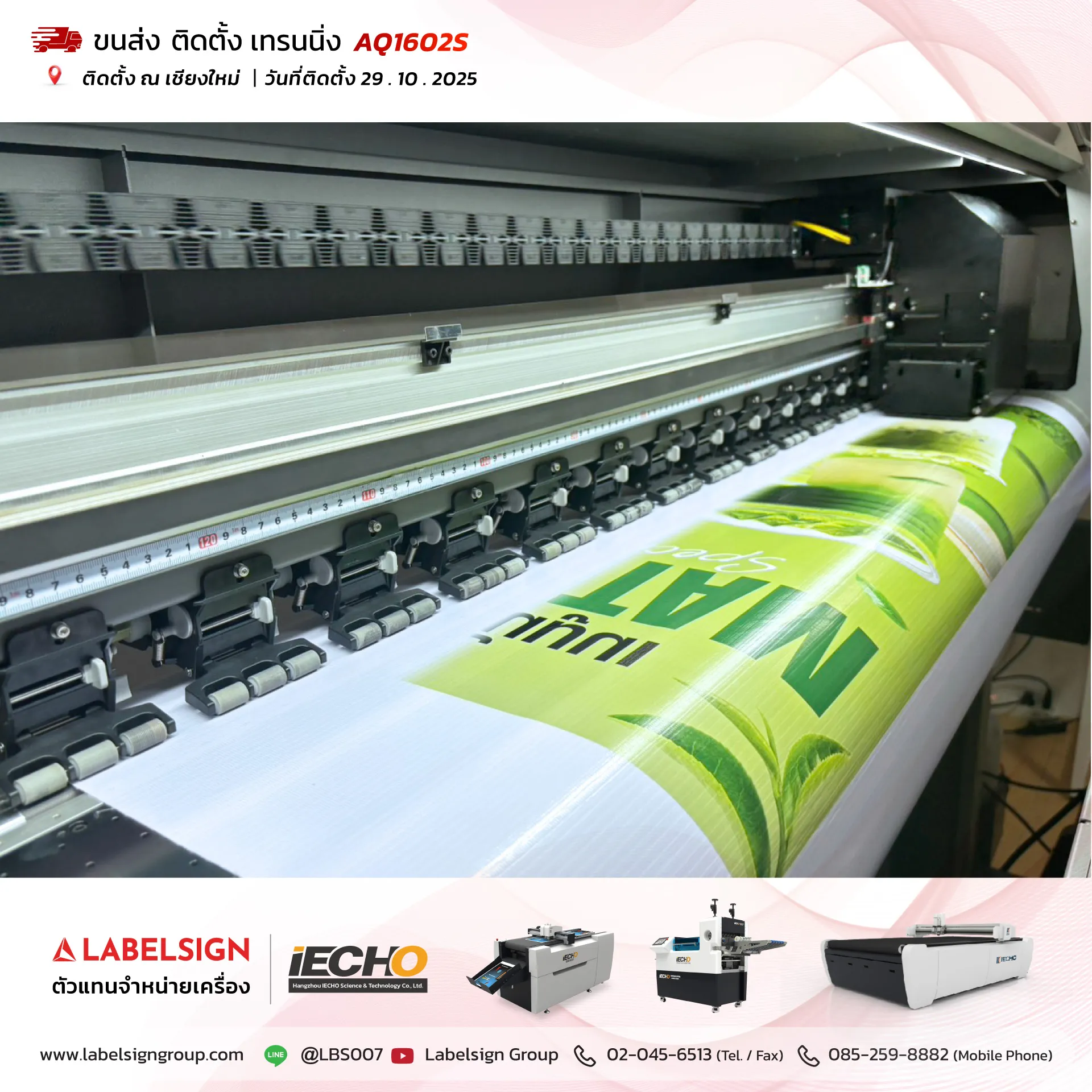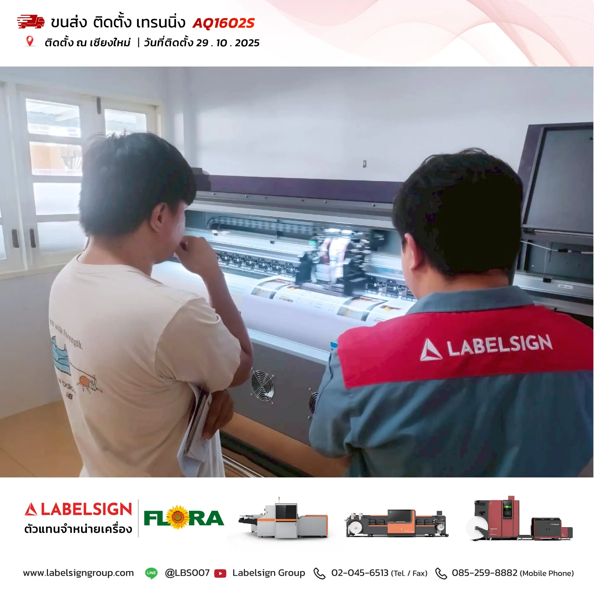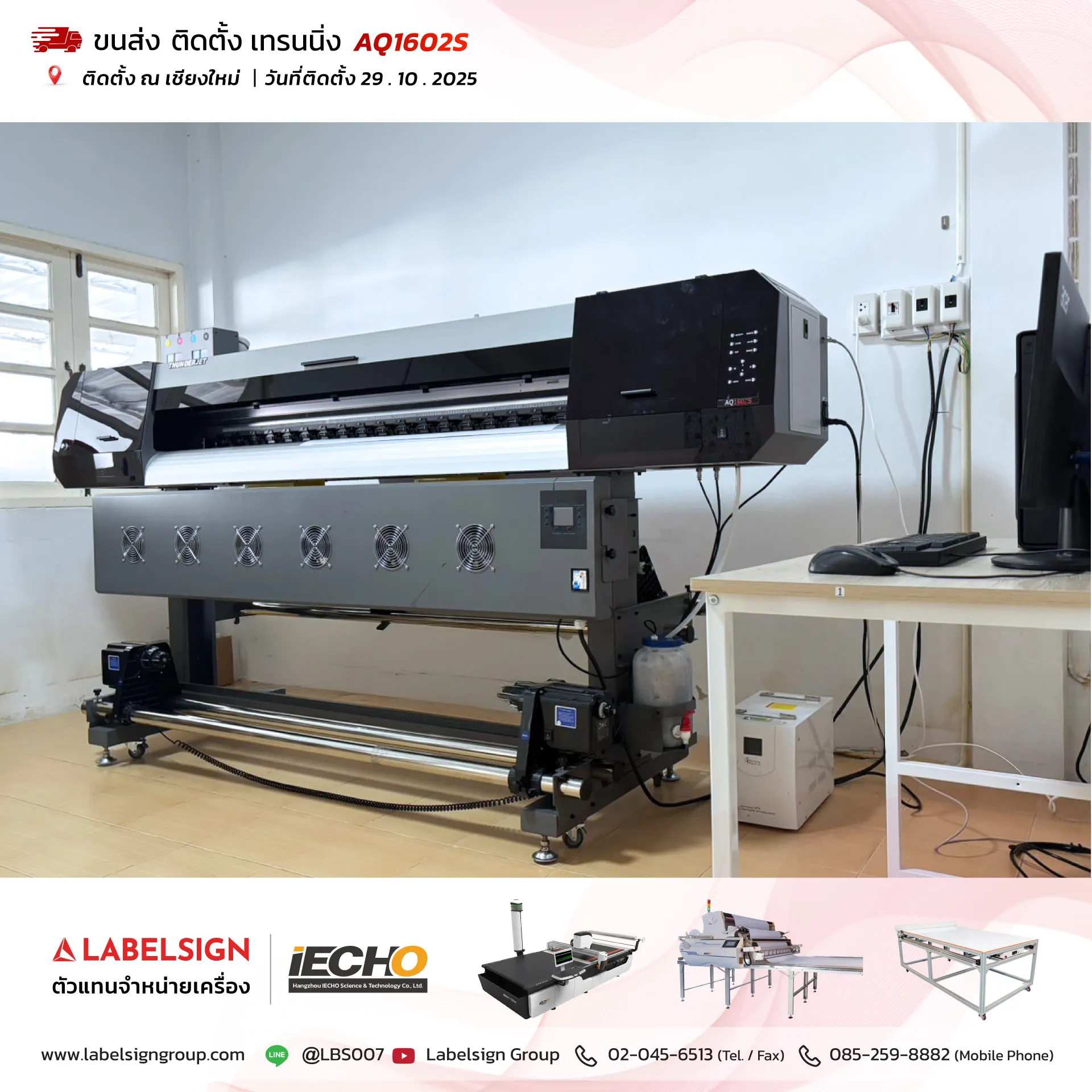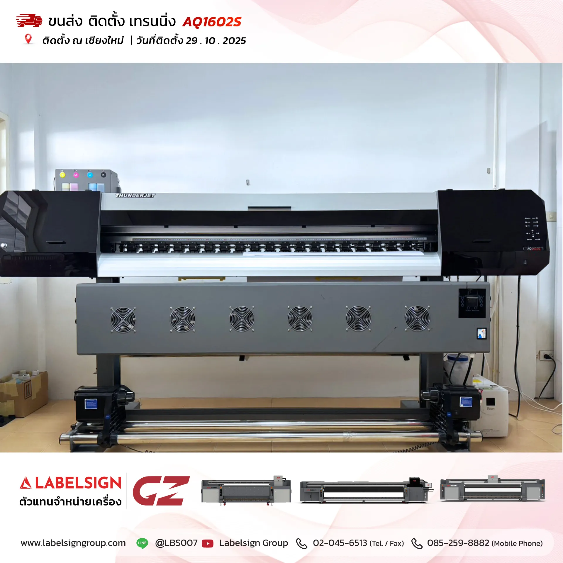 29 ตุลาคม 2025 จัดส่ง ติดตั้ง เทรนนิ่ง เครื่องพิมพ์สติกเกอร์ Eco Solvent Printer Model : AQ1602S ติดตั้ง ณ เชียงใหม่ ขอบพระคุณลูกค้าที่เลือกใช้บริการ "เลเบิ้ลไซน์"