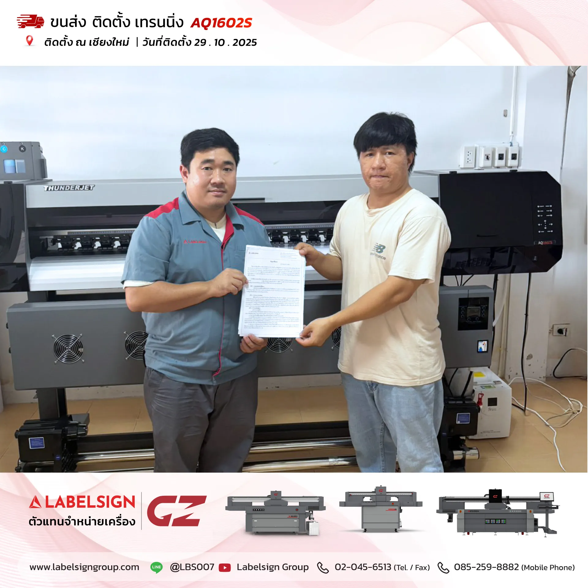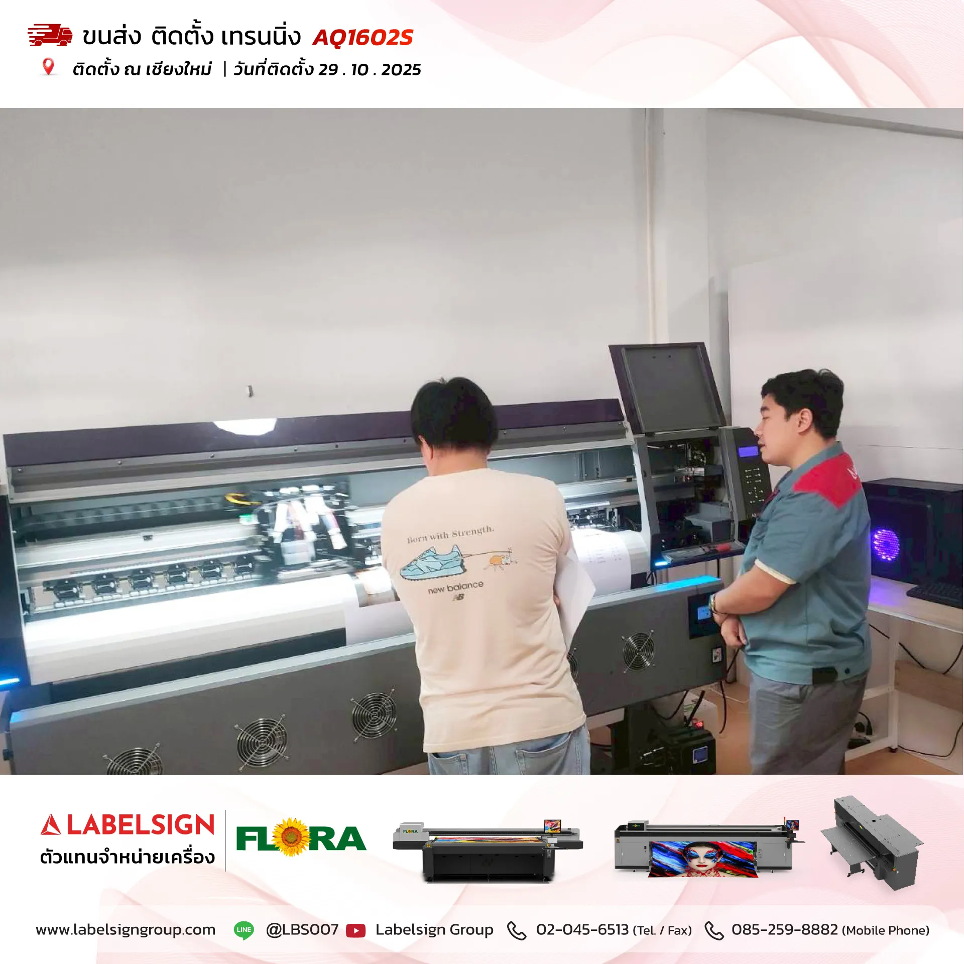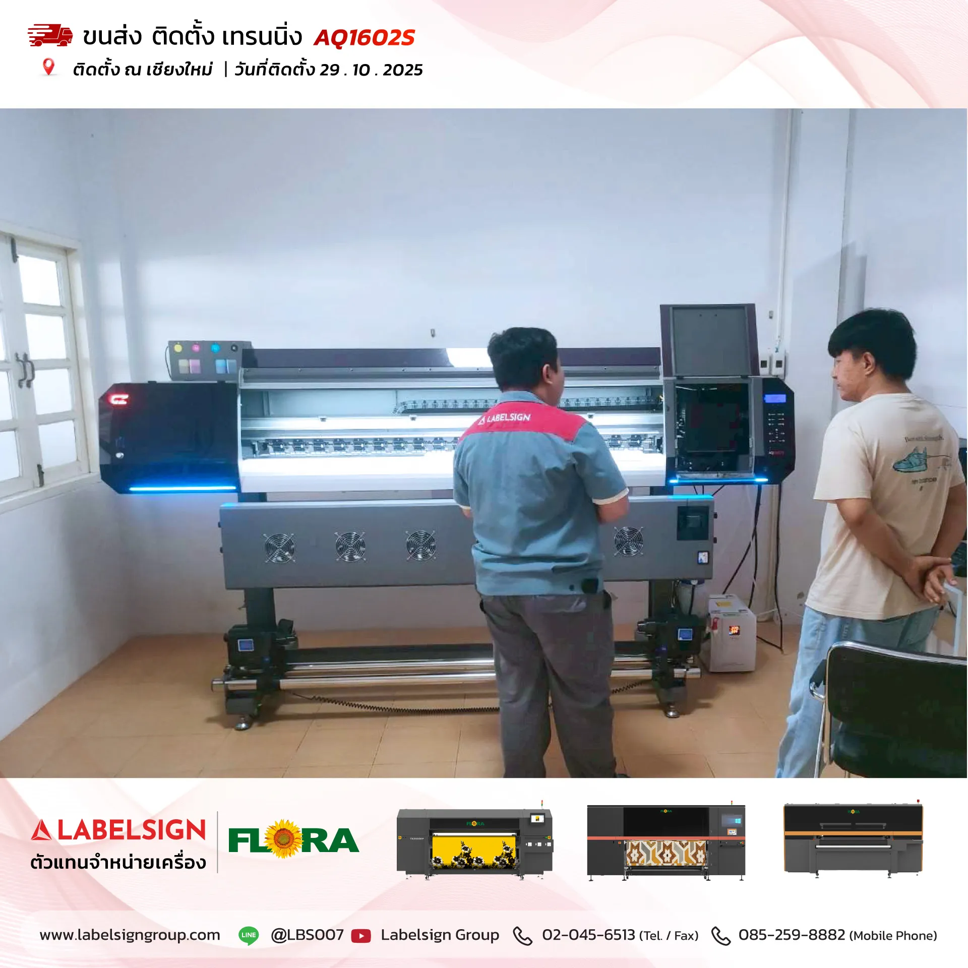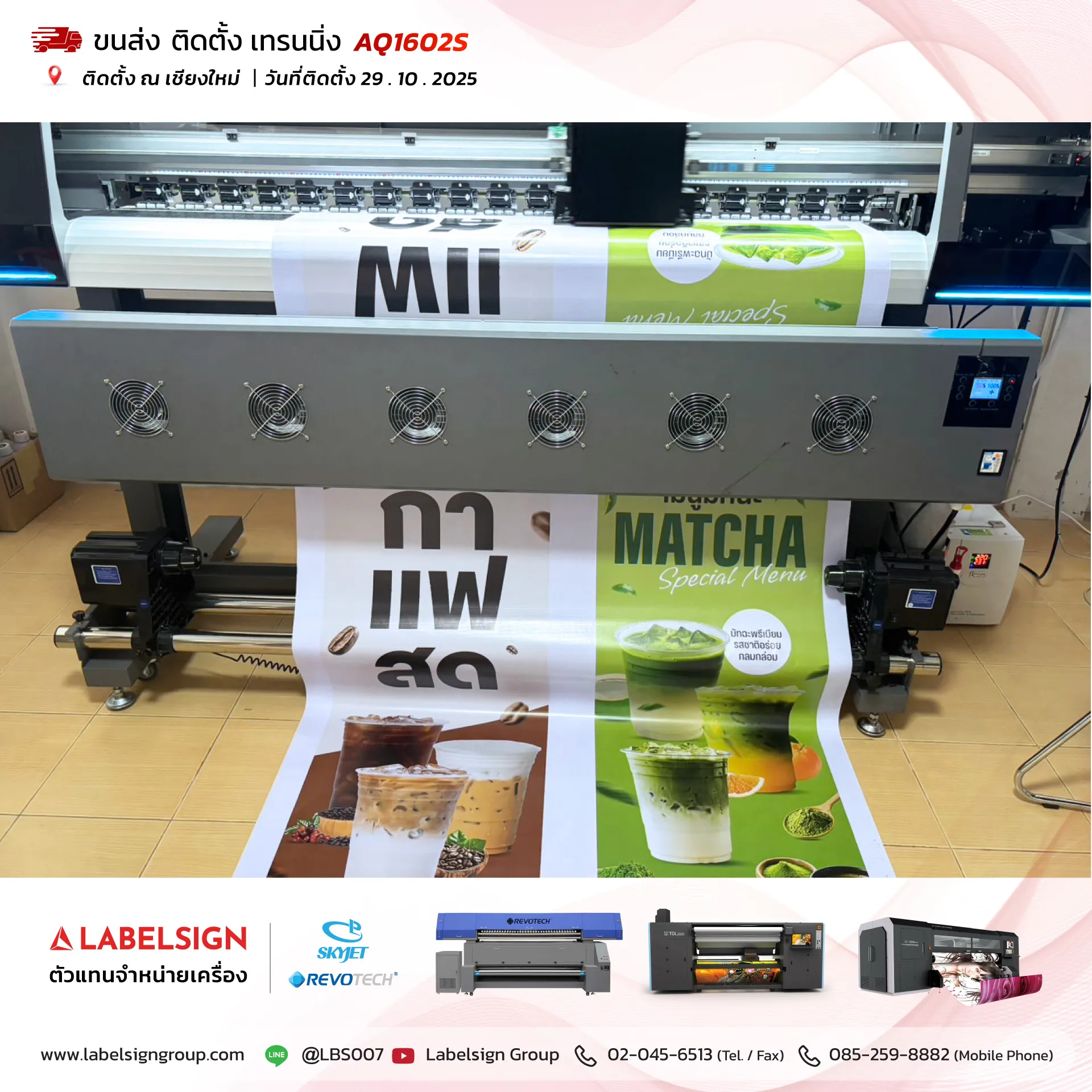 29 ตุลาคม 2025 จัดส่ง ติดตั้ง เทรนนิ่ง เครื่องพิมพ์สติกเกอร์ Eco Solvent Printer Model : AQ1602S ติดตั้ง ณ เชียงใหม่ ขอบพระคุณลูกค้าที่เลือกใช้บริการ "เลเบิ้ลไซน์"
